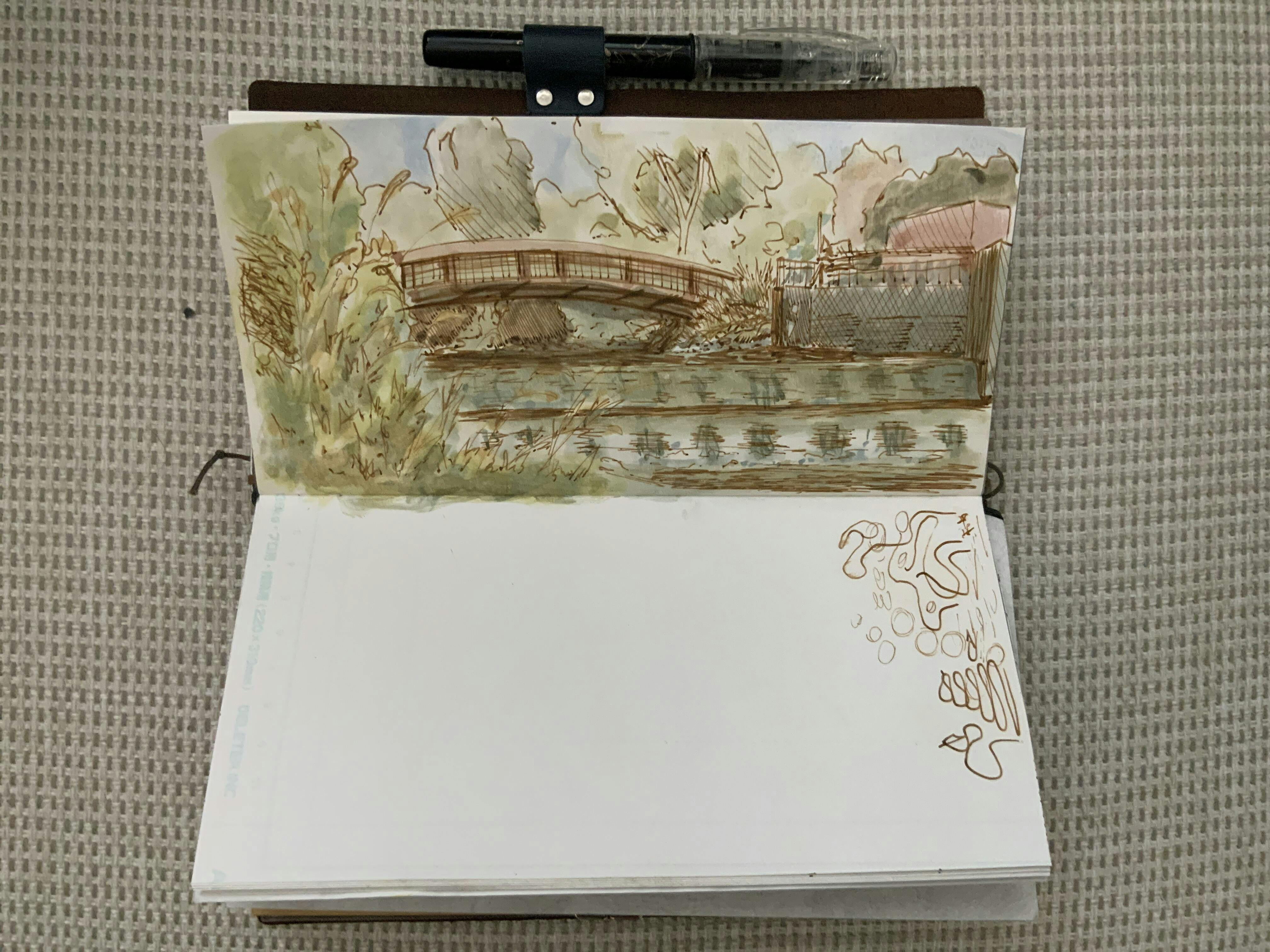 The biggest complaint I have is the barrel circumference and the fact that I can’t post the cap. One would think that for a pen that depends on keeping the cap handy, it would be a priority to post the cap. Just a few threads on the end cap of the barrel would do the trick! But as I am sketching in parks, next to rivers and on trails I must keep track of the cap like I would my car keys, hidden deep in a bag pocket to ensure safety. Which then leads to the feed drying up a bit as I pause to observe or ponder or get distracted by the goings on. Also I have big hands and it hurts my hand to draw with it for too long. A self adhesive wrap is resolving that issue currently, but it would be nice to have a wider barreled option.